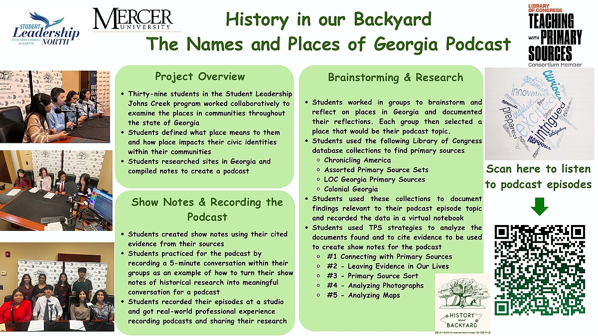 The History in our Backyard: The Names and Places of Georgia Podcast is an inquiry project where high school students in Student Leadership North conducted local history research about names of places in Georgia. Students analyzed primary sources using the Library of Congress’ archive and Teaching with Primary Sources strategies to write and record show notes with conversations about why local histories are important to understanding the meaning of place and civic identity. This grant funded the inaugural season of this podcast with five episodes about William Hartsfield and Maynard Jackson (Atlanta Hartsfield-Jackson Airport), Lake Lanier, Chickamauga, and Tallulah Falls.
